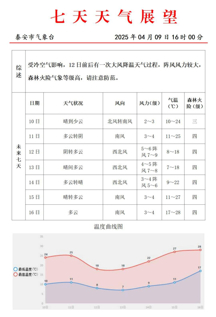 齐鲁网·闪电新闻4月10日讯近日,泰安的天气将出现明显变化。根据最新的天气预报,今天(4月10日)白天至夜间,泰安天气由晴转多云,南风2到3级,湖面3到4级。白天气温将在23℃左右,夜间气温将降至11℃,温差较大,出行时注意增添衣物以应对较大的温差。